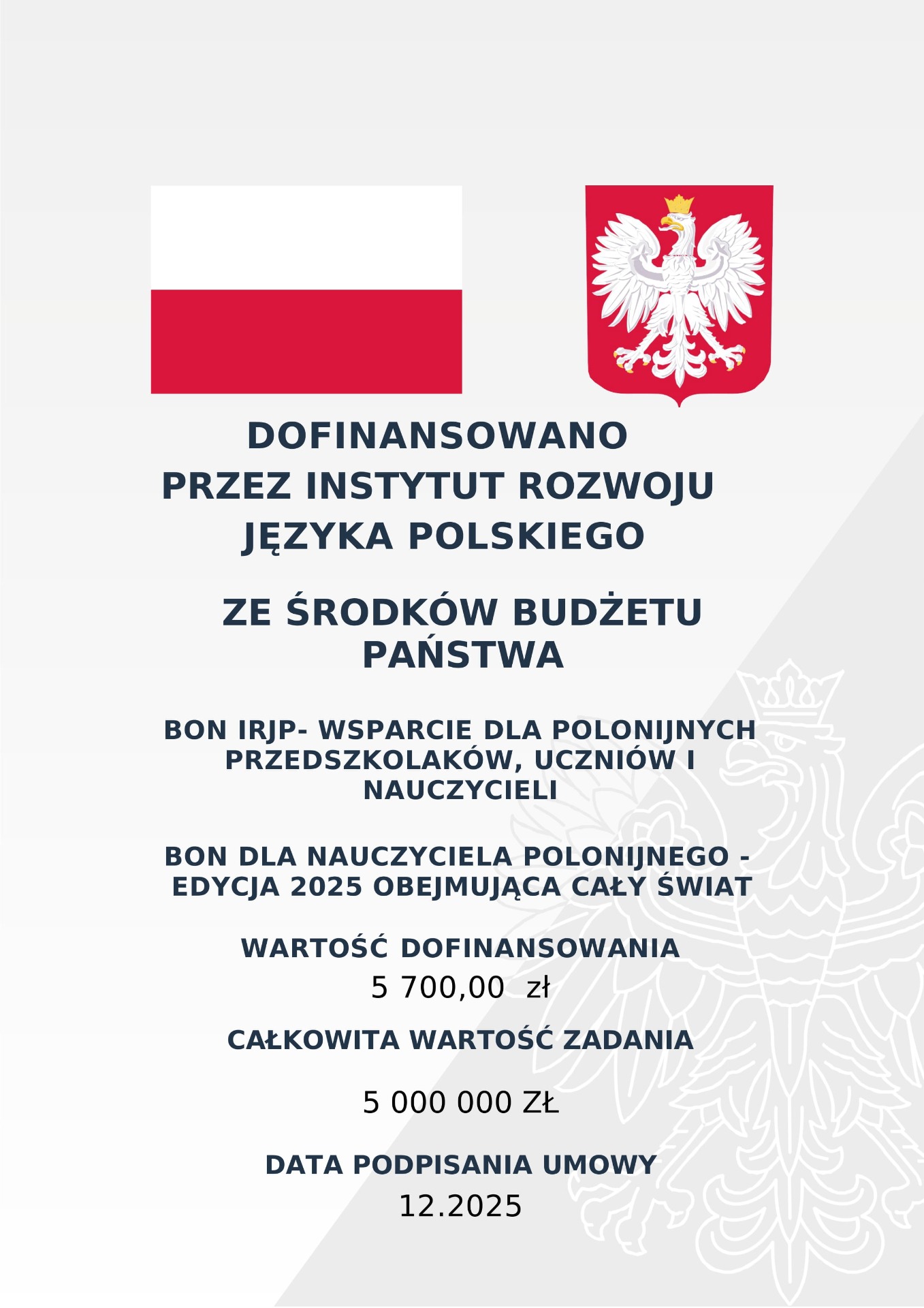 Końcówka starego roku przyniosła dobre wieści. W ramach projektu "Bon dla nauczyciela polonijnego" udało się pozyskać 5700 zł, które nauczyciele przeznaczą na rozwój zawodowy lub zakup pomocy dydaktycznych.